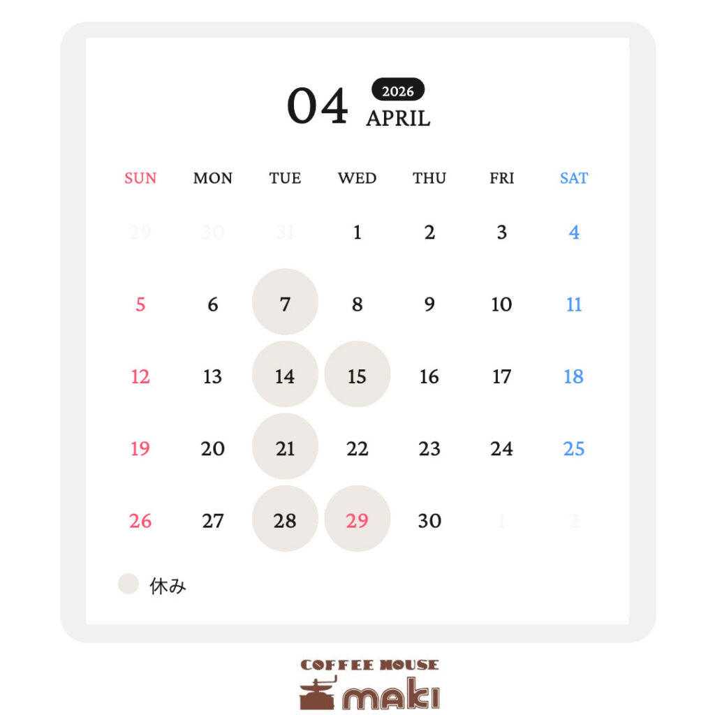 2026年4月は下記の通り営業しております。