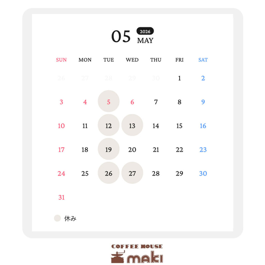 2026年5月の定休日 2026年5月は下記の通り営業しております。 なお、営業時間は8:30から17:00(L.O.16:30)となっております。 モーニング 8:30〜12:00(数量限定。なくなり次第終了) 通常の火曜日に加え、13日(水)と27日(水)もお休みとなります。 ご不便をおかけしますが、よろしくお願いいたします。